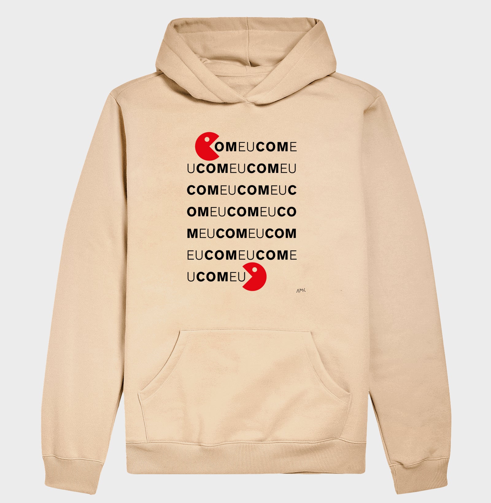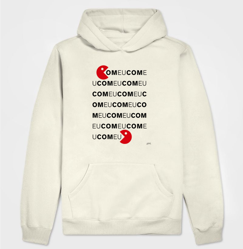 eucomeu é uma estampa baseada em um livro de poemas circulares que experimentam os significados de comer e seus enovelamentos em várias esferas da vida. Tendo a espiralidade do tempo exûnico como referência, os poemas-rodas se entremeiam, entrecruzam, omitem e revelam leituras sem início ou fim que incentivam uma percepção circular de mundo.