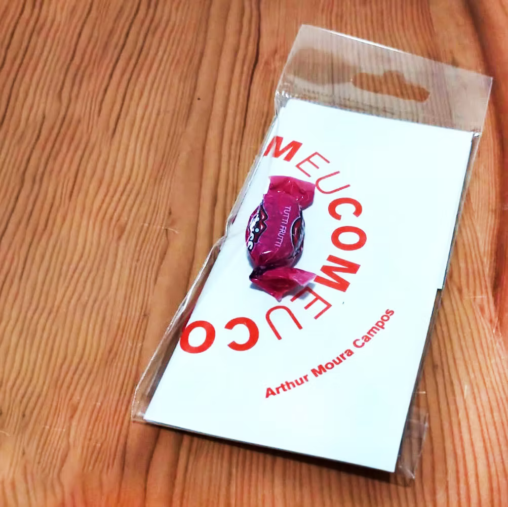 eucomeu é um livro de poemas circulares que experimentam os significados de comer e seus enovelamentos em várias esferas da vida. Tendo a espiralidade do tempo exûnico como referência, seus poemas-rodas se entremeiam, entrecruzam, omitem e revelam leituras sem início ou fim que incentivam uma percepção circular de mundo. Cada livrim vem com um adesivo da ilustração desse ser que está prestes a se engolir e uma balinha pra ser comida/lida/lambida. As impressões em risografia das capas e cartazes foram feitas pelo Atêlie Entrecampo - Belo Horizonte.