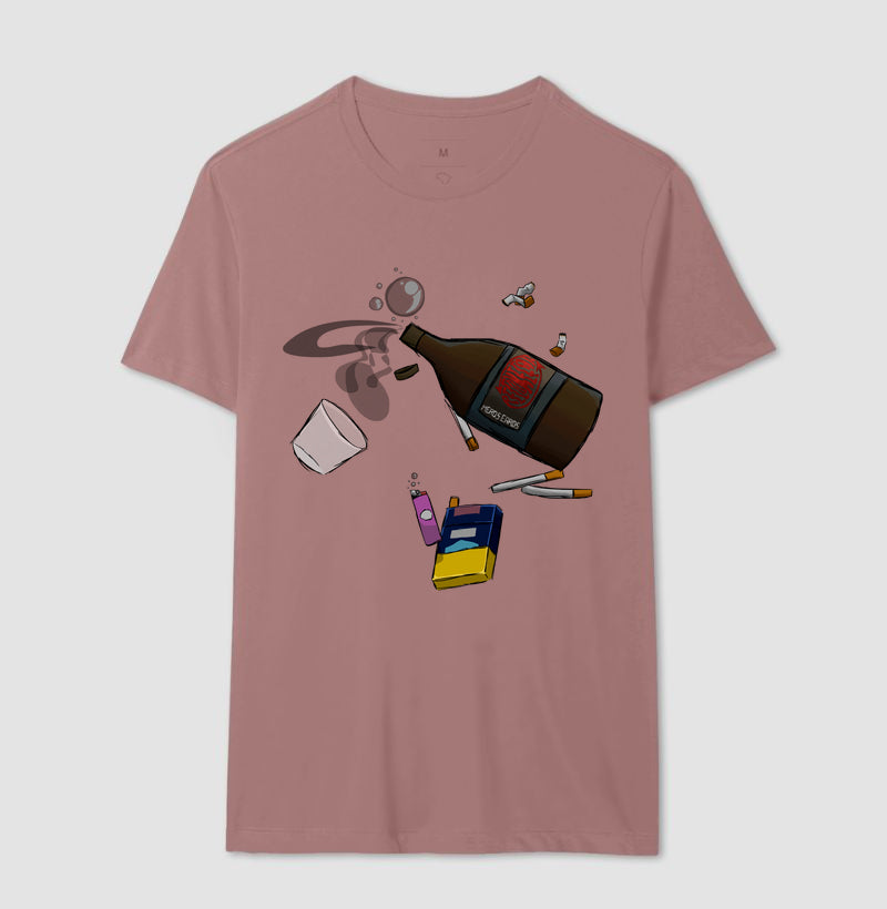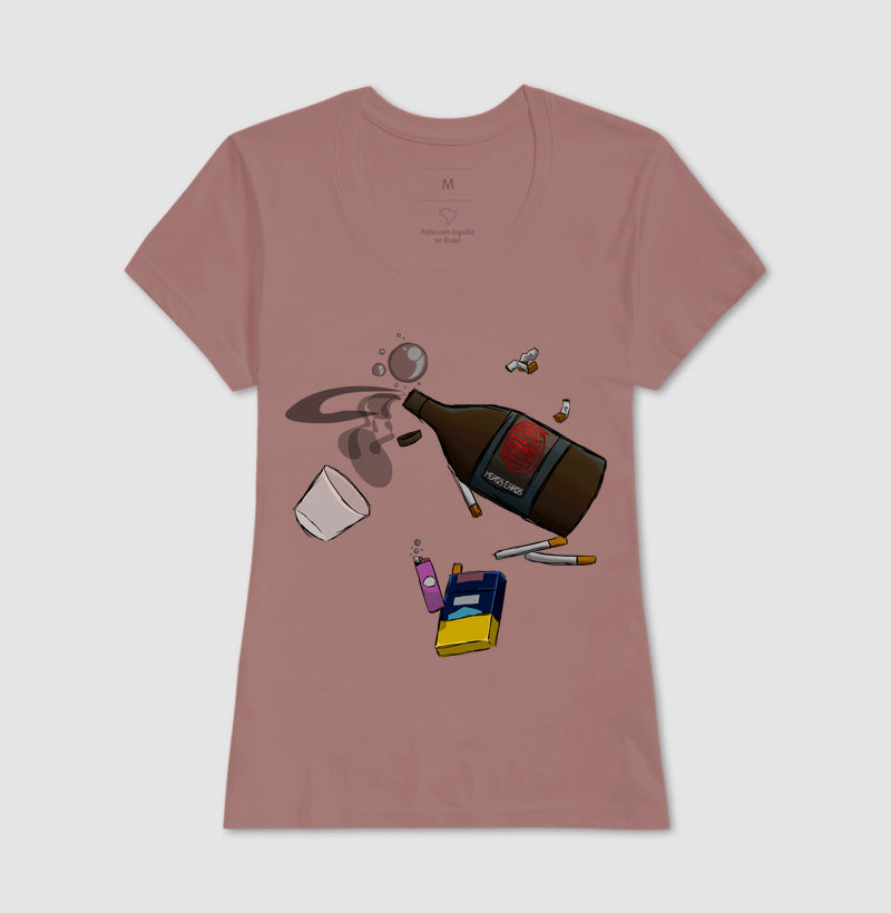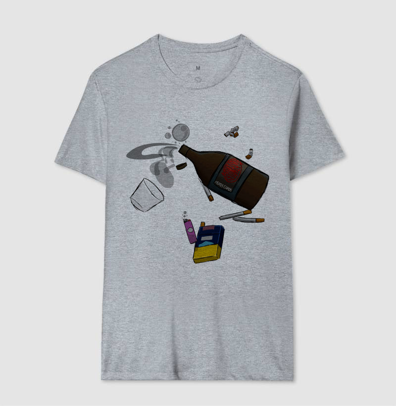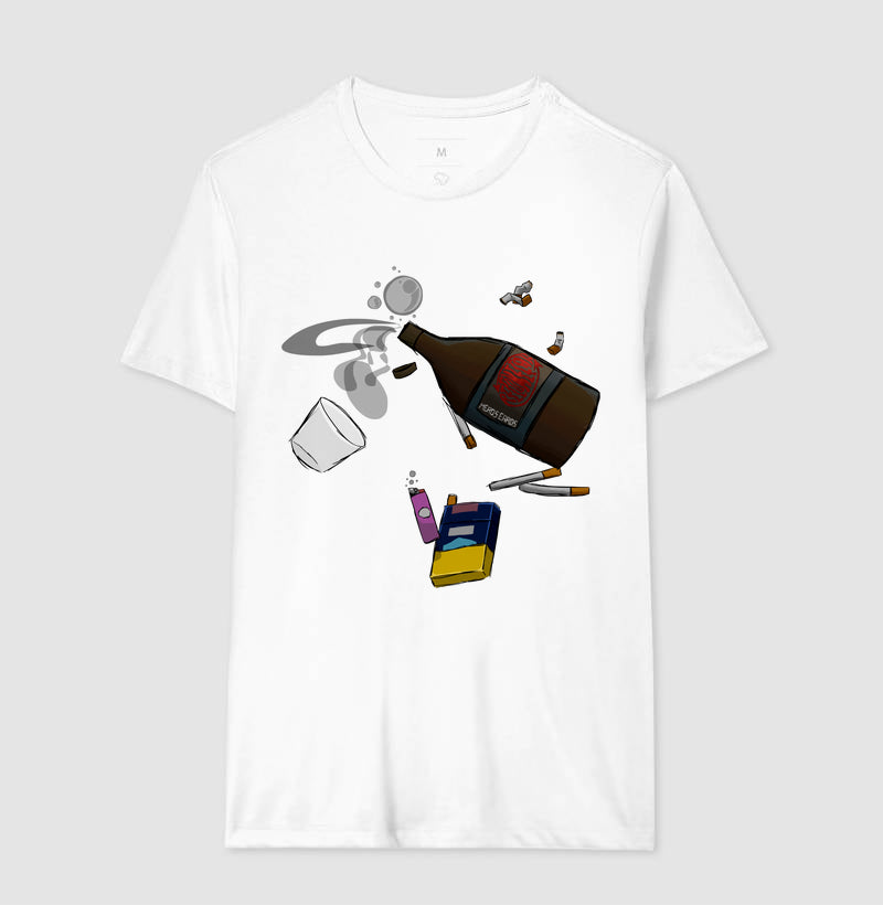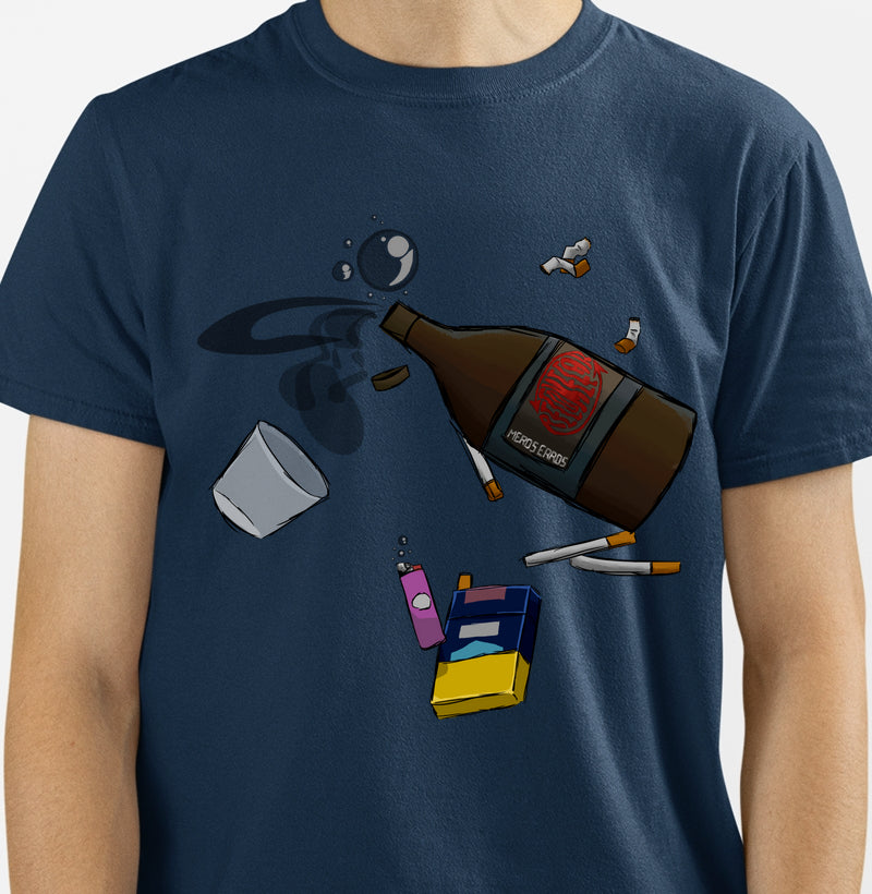 Fui uma das primeiras pessoas a ouvir a linda música "Recomeçar" de mEros Erros. Eu vi algo triste nela, como se estivesse afundando em lágrimas, em ansiedade. Então, fiz uma garrafa de conhaque esvaziando em uma mar de lágrimas, junto de um maço de cigarro, com uns cigarros já queimados e outros ainda não acesos. Fiz também o copo e o isqueiro para representar mais a bebida e o fumo da ansiedade.