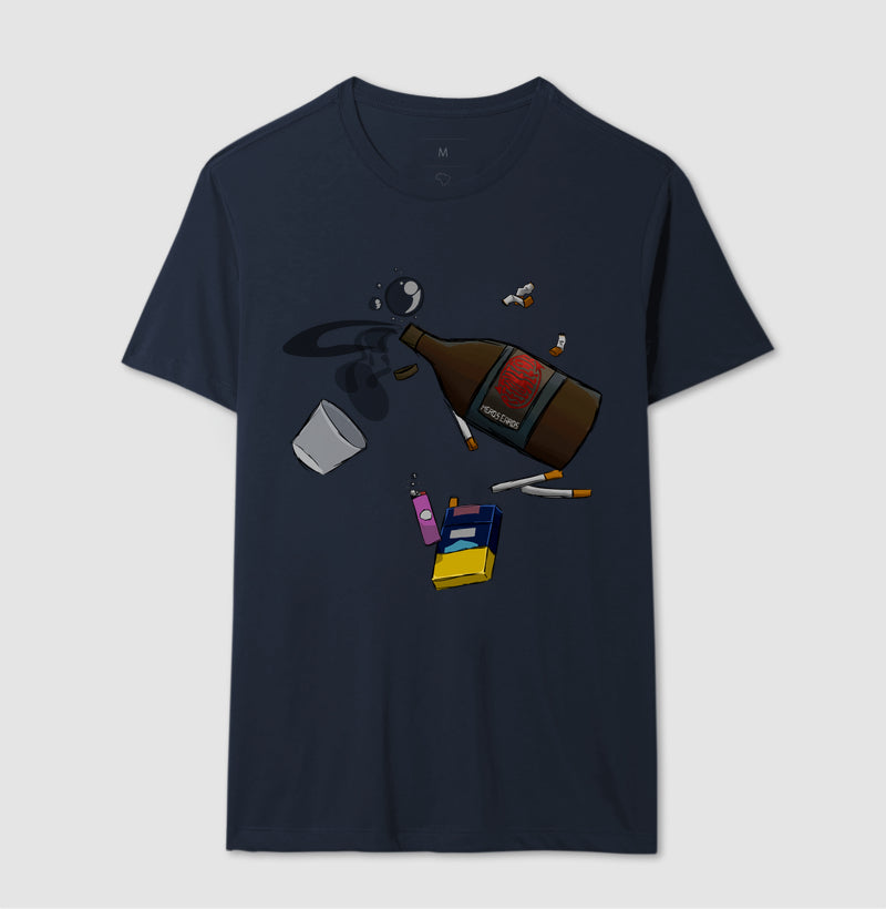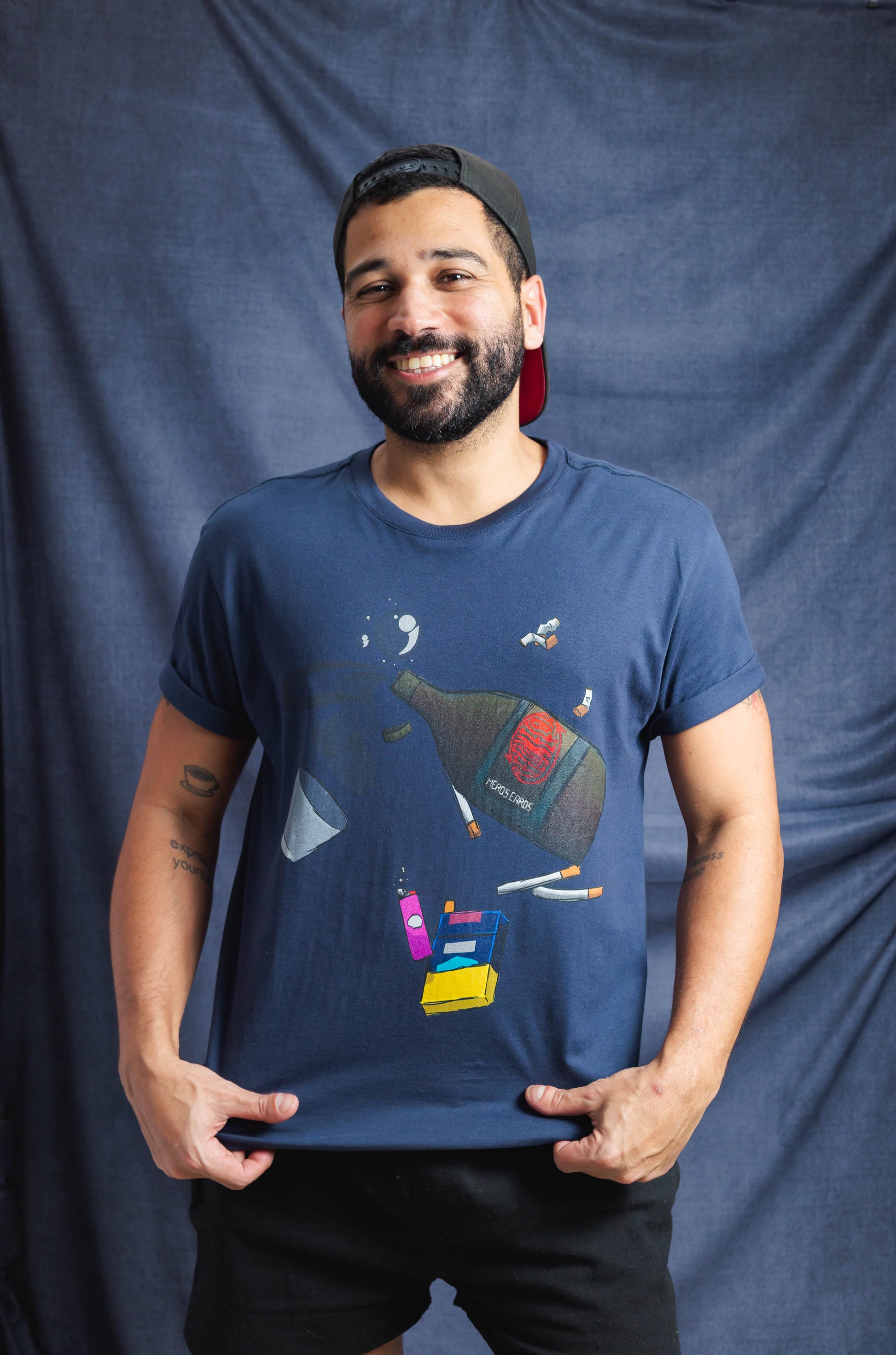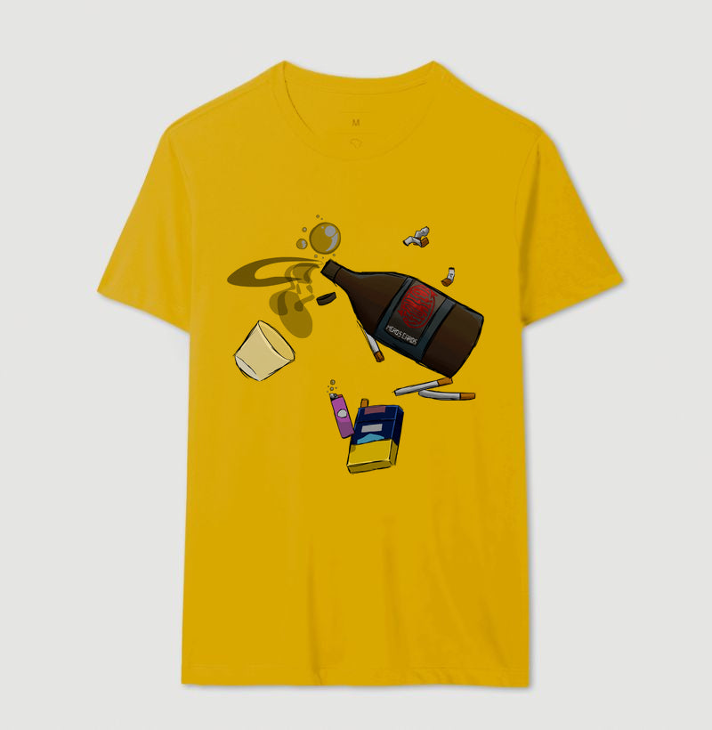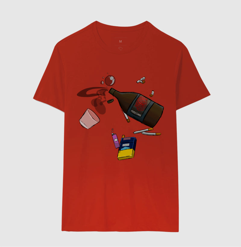 Fui uma das primeiras pessoas a ouvir a linda música "Recomeçar" de mEros Erros. Eu vi algo triste nela, como se estivesse afundando em lágrimas, em ansiedade. Então, fiz uma garrafa de conhaque esvaziando em uma mar de lágrimas, junto de um maço de cigarro, com uns cigarros já queimados e outros ainda não acesos. Fiz também o copo e o isqueiro para representar mais a bebida e o fumo da ansiedade.