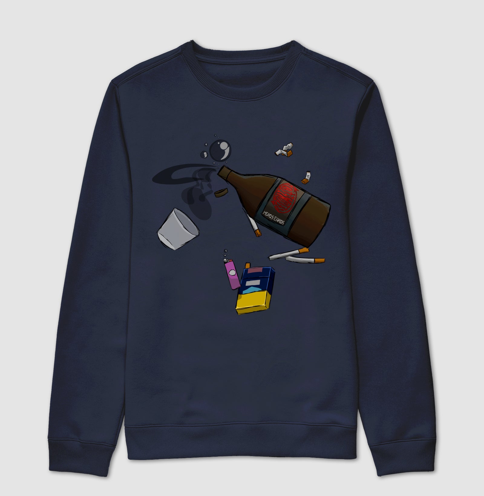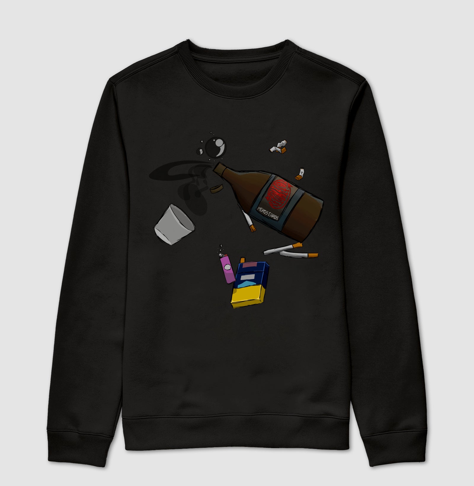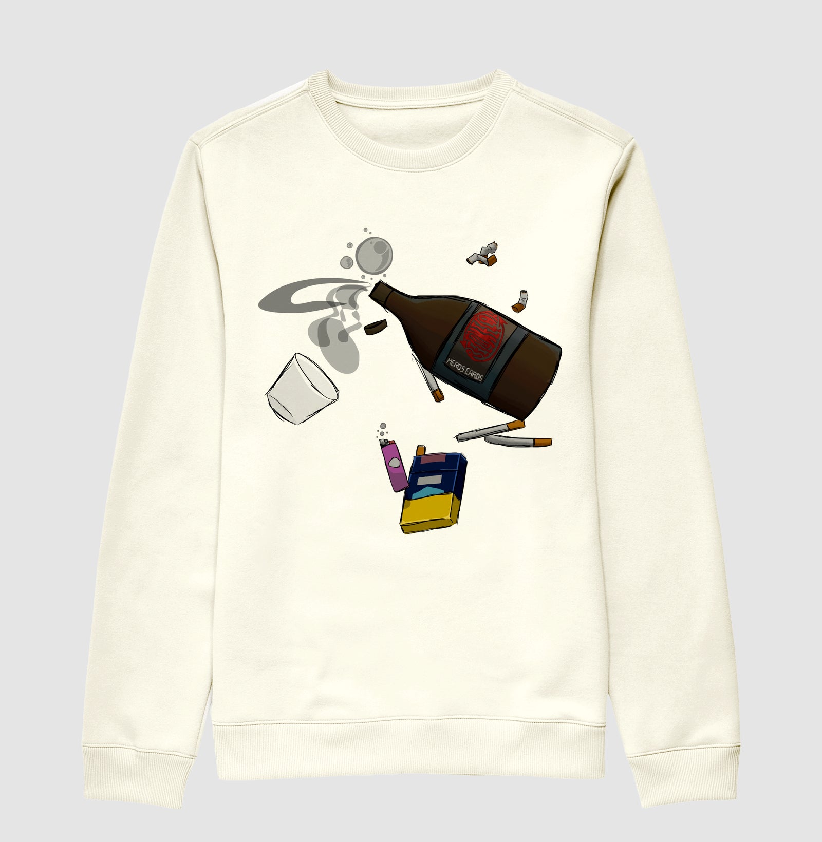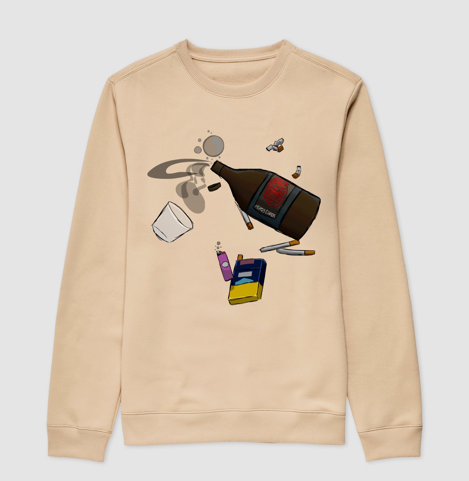 Fui uma das primeiras pessoas a ouvir a linda música "Recomeçar" de mEros Erros. Eu vi algo triste nela, como se estivesse afundando em lágrimas, em ansiedade. Então, fiz uma garrafa de conhaque esvaziando em uma mar de lágrimas, junto de um maço de cigarro, com uns cigarros já queimados e outros ainda não acesos. Fiz também o copo e o isqueiro para representar mais a bebida e o fumo da ansiedade.